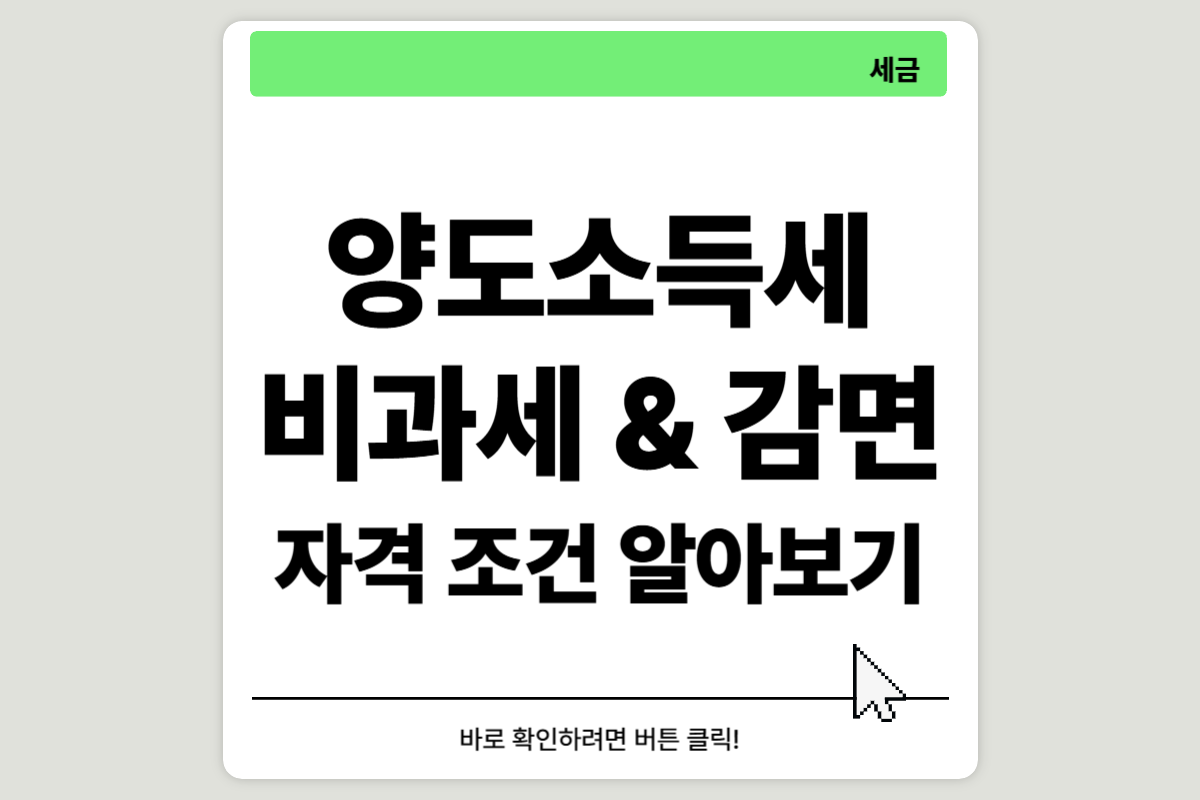 2025년부터 새롭게 개정된 세법에 따라 양도소득세 비과세와 감면 규정이 일부 변경되었습니다. 정부는 서민 주거 안정과 실수요자 보호를 위해 양도소득세 비과세 범위를 넓히고, 장기보유자 및 임대사업자에게도 다양한 절세 혜택을 제공하고 있습니다. 양도소득세 비과세 및 감면 자격조건을 지금 바로 확인하고 싶으시다면, 아래 썸네일과 버튼을 통해서 바로 확인하시기 바랍니다. → 비과세 자격조건 알아보러 바로 가기 ← 목차양도소득세 비과세의 기본 개념1세대 1주택 비과세 – 대표적인 양도소득세 비과세 제도귀농·귀촌 농업인 대상 감면 및 비과세 혜택장기임대주택자 지원 – 비과세 혜택 확대비과세 및 감면 적용 시 주의사항절세 전략 – 세무 전문가의 팁요약 및 결론총 정리 – 2025년 절세 핵심 요약1️⃣ 양도소득..